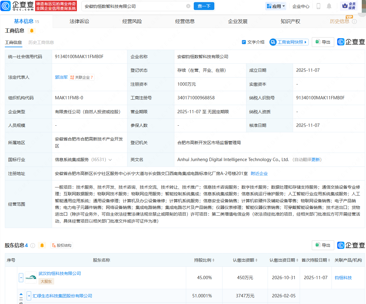 近日,安徽钧恒数智科技有限公司成立,法定代表人为郭治军,注册资本为1000万元,经营范围包含:数据处理和存储支持服务;物联网技术服务;人工智能通用应用系统;集成电路销售等。企查查股权穿透显示,该公司由汇绿生态(001267)旗下武汉钧恒科技有限公司等共同持股。