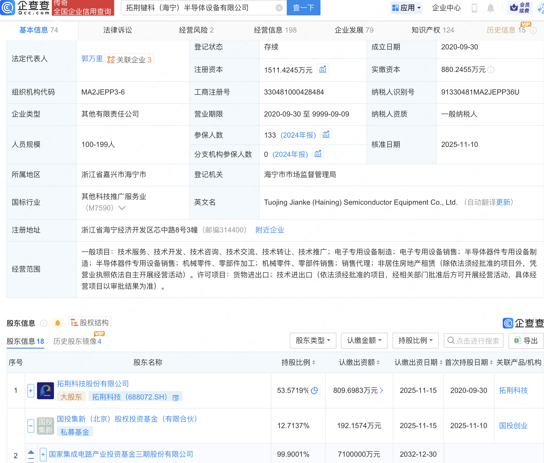 近日,拓荆键科(海宁)半导体设备有限公司发生工商变更,新增国家集成电路产业投资基金三期股份有限公司旗下国投集新(北京)股权投资基金(有限合伙)等为股东,同时注册资本增至1511.42万元。企查查信息显示,该公司成立于2020年,经营范围包含:电子专用设备制造;电子专用设备销售;半导体器件专用设备制造等,其大股东为拓荆科技(688072),持股53.57%。